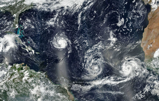 Imagen facilitada por la NASA que muestra los huracanes (i-d) Florence, Isaac y Helene avanzando por aguas del Atlántico Norte. EFE
