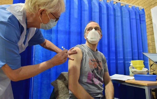 David Farrell, paciente de 51 años, recibe una de las dos vacunas de Pfizer y BioNtech en un centro de vacunación en Cardiff (Reino Unido). EFE/Ben Birchal