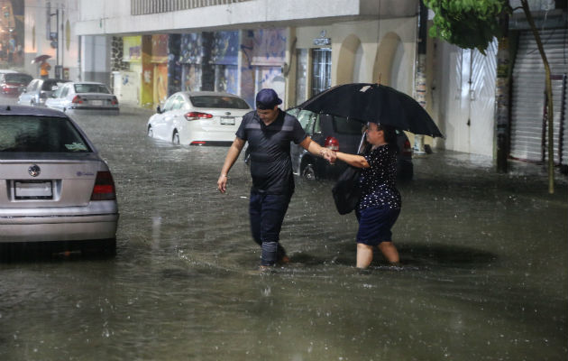 Dos personas cruzan una calle inundada en el puerto de Acapulco por el huracán Rosa.