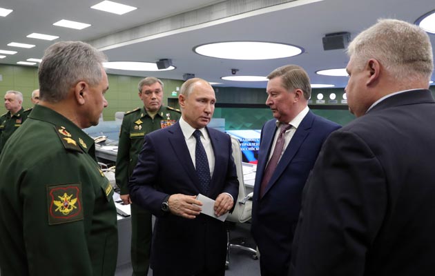 El presidente ruso, Vladimir Putin (c-i); el jefe de Estado Mayor ruso, Valery Gerasimov (i), y el representante para la Protección del Medioambiente, Ecología y Transporte, Sergei Ivanov (2d), visitan el Centro de Control Nacional de Defensa en Moscú (Rusia).FOTO/EFE