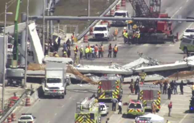 Un puente peatonal recién instalado colapsó el jueves en la Universidad Internacional de Florida en el área de Miami. Al menos cinco autos quedaron aplastados y se vio cuando varias personas eran llevadas del lugar en ambulancias. Por el momento se desconoce el número de heridos o si hay víctimas fatales. El gobernador Rick Scott tuiteó que había hablado con el jefe de policía de Miami-Dade, Juan Pérez, sobre la caída del puente. “Estaré permanentemente en contacto con la policía durante toda la jornada”, dijo Scott. La calzada de 950 toneladas había sido instalada el sábado. El tramo principal fue armado a un costado del camino mientras se construían torres de apoyo en los extremos. Camiones de bomberos, patrullas y otros vehículos de emergencia se encontraban en el lugar. El puente construido a un costo de 14,2 millones de dólares cruzaba una carretera transitada de siete carriles que separa el campus universitario de la ciudad de Sweetwater.