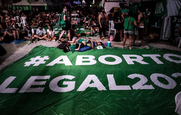 Manifestantes acampados a las puertas del Congreso argentino, a la espera de la votación en el Senado de la legalización del aborto. Foto: EFE/ Juan Ignacio Roncoroni
