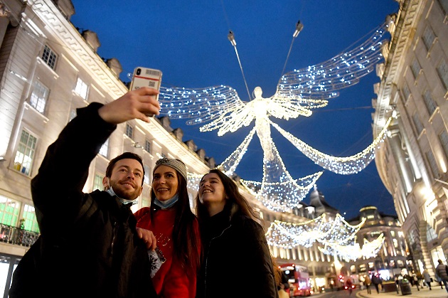 Compradores posan para una fotografía mientras se dirigen a Regents Street en Londres, donde se ha dado un aumento de contagios de COVID-19. Foto: EFE