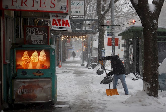 Un hombre quita nieve a lo largo de St. Mark's Place, durante una tormenta de nieve en Nueva York. Foto:EFE