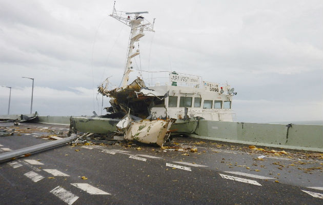 Un barco colisionado con un puente cercano al aeropuerto Kansai. Foto: EFE