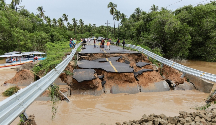 Personal de Protección Civil acordona este lunes el destruido puente que llevaba a la comunidad de Barra Vieja, en el estado de Guerrero (México).