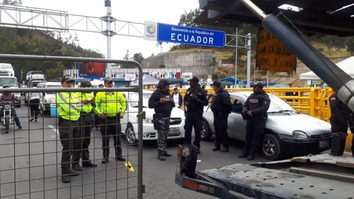Autoridades ecuatorianas custodian este lunes el paso fronterizo del puente Rumichaca, frontera entre Ecuador y Colombia, durante una protesta de migrantes venezolanos que bloquean la vía. FOTO/EFE