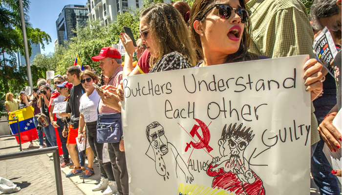 "Cómplices, asesinos, recibiendo dinero manchado", gritaban otros al frente del restaurante, situado en pleno centro financiero de Brickell, curiosamente a pocos metros del consulado general de Venezuela.