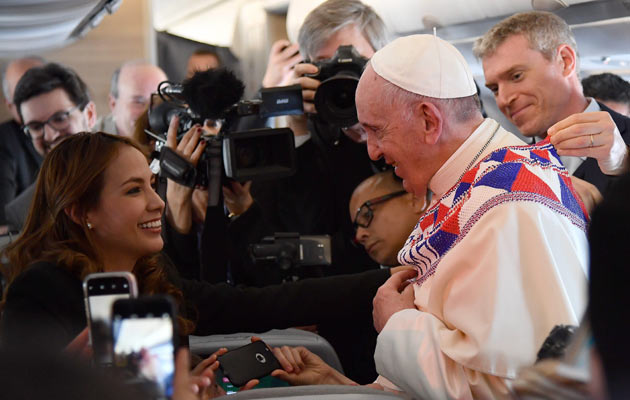 A 37,000 metros de altura y después del desayuno, Jorge Bergoglio acudió a la parte trasera del avión para, como es habitual, saludar a los 70 periodistas que le acompañan en este viaje para participar en la Jornada Mundial de la Juventud (JMJ) en Panamá.