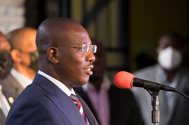 El primer ministro de Haití, Claude Joseph, habla en una rueda de prensa en Puerto Príncipe, Haití. Foto: EFE