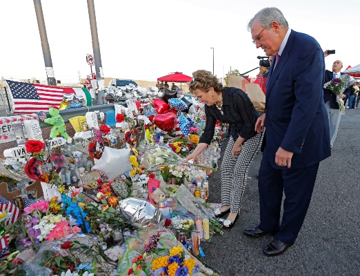 El alcalde de El Paso, Dee Margo (R) y su esposa Adair (L) ponen flores en el improvisado monumento a las víctimas del tiroteo masivo en un Walmart en El Paso, Texas. FOTO/AP