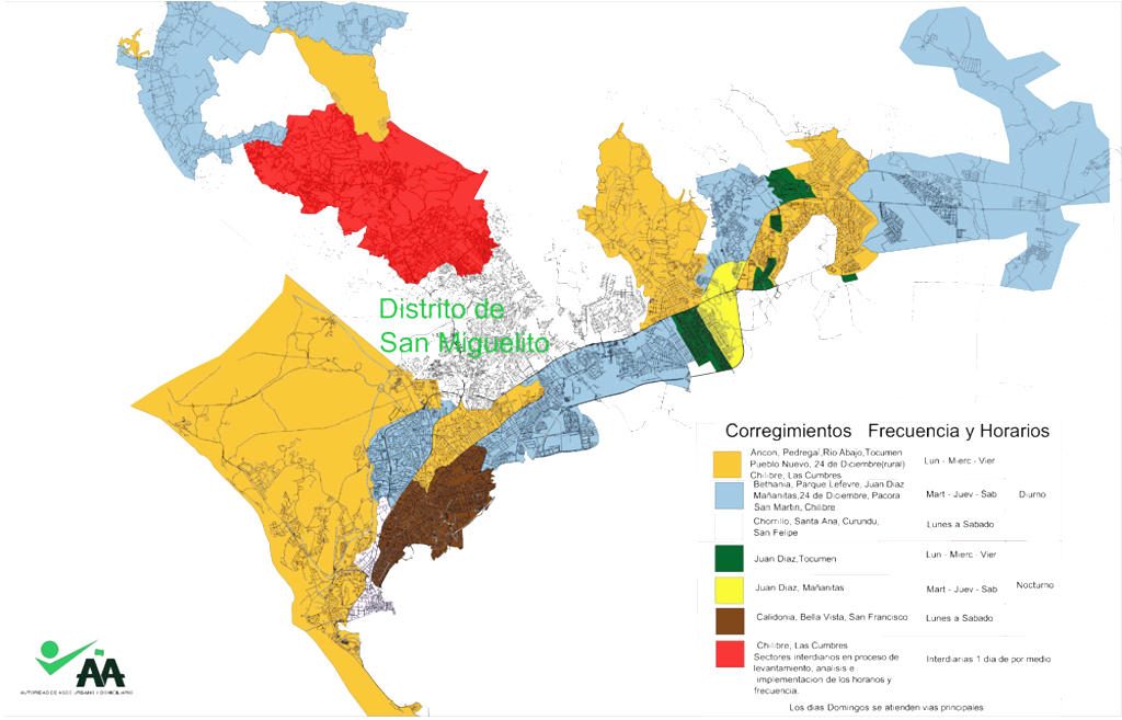Dentro de los horarios de recolección diurnos se encuentran los corregimiento de Ancón, Pedregal, Río Abajo, Tocumen Pueblo Nuevo, 24 de Diciembre (rural) Chilibre y Las Cumbres, que corresponderá el servicio los días lunes, miércoles y viernes.