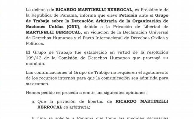 Sidney Sittón, del equipo de abogados de Martinelli, señaló a Acan-Efe que acaba de envió a Ginebra (Suiza) la petición al organismo de Naciones Unidas, debido a que la privación de libertad de Martinelli se da "en violación" de la Declaración Universal de Derechos Humanos y el Pacto Internacional de Derechos Civiles y Políticos