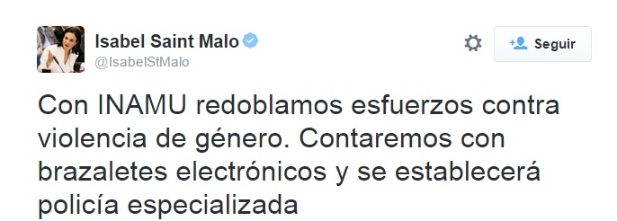 La vicepresidenta de la República, Isabel Saint Malo de Alvarado dio a conocer hoy, domingo a través de su cuenta de Twitter que se establecerá una policía especializada contra la violencia de género. En un escueto tuit, la también canciller panameña reiteró que se contará con los brazaletes electrónicos para frenar estos casos, detallando que se están redoblando esfuerzos contra la violencia de género junto al Instituto Nacional de la Mujer (Inamu). El tema ha sido motivo de preocupación por las autoridades pues según datos oficiales, hasta el 8 de julio han ocurrido 20 víctimas de femicidio y 7 tentativas de femicidio, según información del Ministerio Público (MP). Del total de las 20 víctimas de femicidio, es la ciudad capital la que presenta mayores casos, con 15, le siguen las provincias de Coclé, Veraguas, Chiriquí, Bocas del Toro y Los Santos, con un caso cada una.