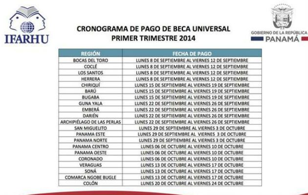 A partir del 6 de octubre de este años se dará inicio al pago del programa Beca Universal con el aumento amparado en la nueva ley que sancionó el presidente de la República, Juan Carlos Varela, informó el Instituto para la Formación y Aprovechamiento de Recursos Humanos (Ifarhu).