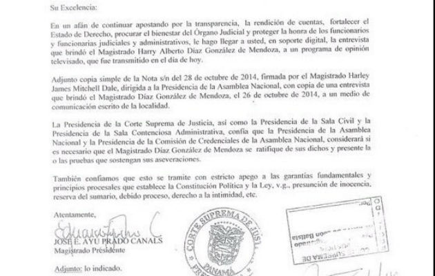 El presidente de la Corte Suprema de Justicia (CSJ), José Ayú Prado envió una carta al presidente de la Asamblea Nacional (AN), Rubén De León, donde le adjunta entrevista que dio el magistrado Harry Díaz a un medio de comunicación y presente todas las pruebas de sus acusaciones.  "La Presidencia de la corte Suprema de Justicia, así como la Presidencia de la Sala Civil y la Presidencia de la Sala Contenciosa Administrativa, confía que la Presidencia de la Asamblea Nacional y la Presidencia de la Comisión de Credenciales de la Asamblea Nacional, considerará si es necesario que el magistrado Harry Díaz se ratifique de sus dichos y presente la o las pruebas que sostengan sus aseveraciones", señala el documento. Ayú Prado espera que la Asamblea, haga los trámites con apego a las garantías fundamentales y principios procesales que establece la Constitución Política y la ley como presunción de inocencia, reserva del sumario, debido proceso, derecho a la intimidad, entre otros. En la entrevista televisiva, Díaz indicó que la reelección fue para él una sorpresa una llaga recién abierta en el pleno de la Corte, ya que el magistrado Ayú Prado en múltiples ocasiones le prometió su voto. "Si hay que mentir, si hay que ser un hipócrita ser una persona manejable e indigna que falta a su palabra por ocupar uno de estos cargos quédense con esos cargos", agregó.  Por su parte el magistrado presidente de este Órgano Judicial, Ayú Prado, aseguró que en la votación donde fue reelecto "no se violó ni una sílaba".