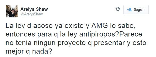 Arelys Shaw escribió: "La ley de acoso ya existe y AMG (Ana Matilde Gómez) lo sabe, entonces, para qué la ley antipiropos?. Parece que no tenía ningún proyecto que presentar ¿y esto mejor que nada?.