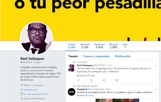 Conocido como el especialista en campañas sucias, el mexicano Raúl Velázquez, alias "El Chacal", activó el call center este domingo en redes sociales para atacar al partido Cambio Democrático (CD), por sus elecciones internas. En varias publicaciones de los integrantes de este colectivo, "El Chacal" les replicaba imágenes con mensajes negativos hacia los opositores. Ante tanta ofensiva incesante, el CD decidió bloquear a este usuario @1RAVEGA. Y es que "El Chacal" ya tiene antecedentes de ataques no solo a los opositores del presidente Juan Carlos Varela, sino que el pasado 24 de agosto, hizo alusión a una cuenta ficticia donde modificó el logotipo de Panamá América para hacer una parodia, la cual ha sido denunciada. Por ello, fuentes allegadas al Palacio de las Garzas colocan a Velázquez como el responsable de las campañas de ataque del Gobierno en redes sociales contra periodistas, medios de comunicación y opositores del gobierno de Varela. En su momento, críticos del Gobierno lamentaron que se haya acogido a personas denunciadas por atentar contra la integridad humana, como el caso del mexicano Raúl Velázquez, conocido como "El Chacal". Una de las que reaccionó fue la exprimera dama Marta Linares de Martinelli, quien señaló que "ojalá algún día conozcamos quiénes están detrás de campañas sucias. Culparon al CD, y odio de Varela se debe a esto". En tanto, también Luis Eduardo Camacho alzó su voz en aquel momento, alegando que "cuando Varela decidió nombrar a Chino Ken en la presidencia, dejó al descubierto quién hacía campañas sucias en las elecciones y quién las hace hoy". Camacho sostuvo que, efectivamente, se ha tenido conocimiento de que el Partido Panameñista ha obtenido los servicios de una persona especialista en campaña sucia a través de las redes sociales. "Entendemos que es de nacionalidad mexicana, y eso explicaría una serie de documentos y videos que circulan por las redes atacando, para buscar desprestigio de la oposición", señaló el vocero de CD. Agregó que también esto confirmaría el espionaje político que auspicia el Gobierno y el cual no contribuye a la democracia. Pero a "El Chacal" parece no molestarle este rechazo, sino más bien disfruta en redes sociales sus ataques políticos hacía personalidades del opositor partido y medios de comunicación en Panamá. Estos fueron uno de los ataques hacia el partido: