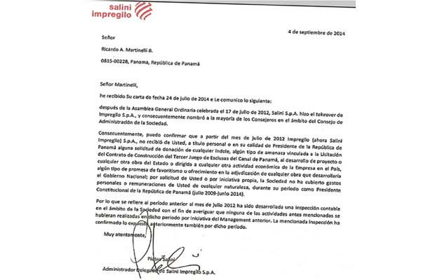 En la citada nota, el director ejecutivo de la empresa italiana, Pietro Salini, dejó claro que Impregilo no recibió del expresidente donación o amenaza alguna vinculada al contrato de construcción del tercer juego de esclusas del Canal de Panamá o al desarrollo de proyecto o cualquier otra obra del Estado o dirigida a cualquier otra actividad económica de la empresa en el país. (Ver imagen).