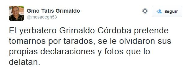 "El yerbatero Grimaldo Córdoba pretende tomarnos por tarados, se le olvidaron sus propias declaraciones y fotos que lo delatan", expresó un usuario de Twitter.
