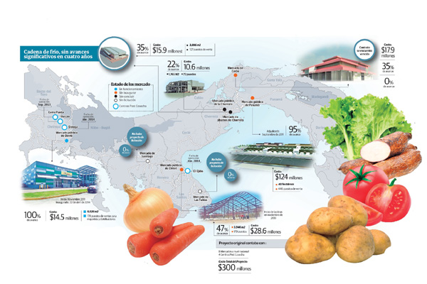 En la actualidad, la Cadena de Frío mantiene paralizada -desde hace cuatro años- la construcción de los mercados de Chitré, en la provincia de Herrera; los dos mercados de La Chorrera, en la provincia de Panamá Oeste, y el mercado público de Colón, obras que suman 72.6 millones de dólares.