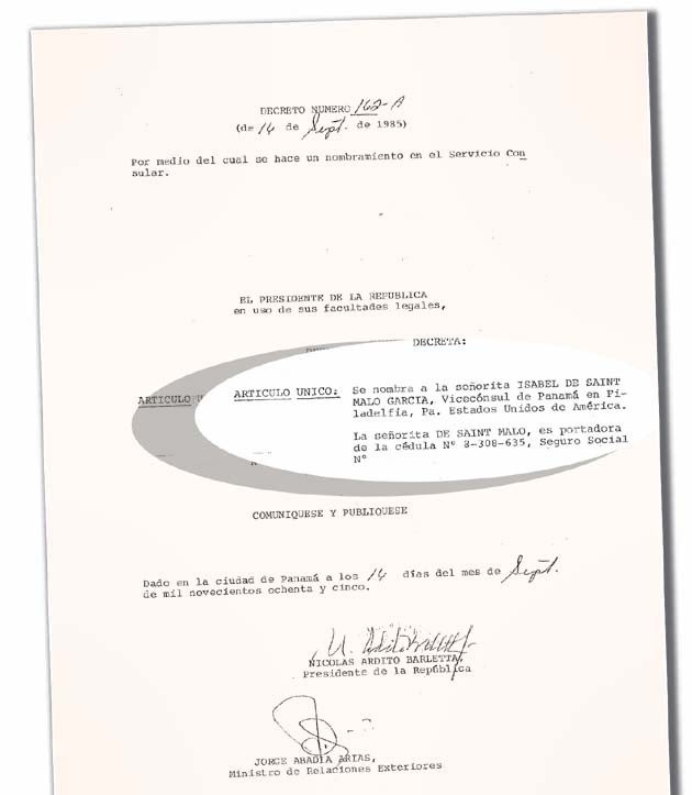 El documento por ninguna parte aclara que se trataba de una pasantía. Y solo dos meses después, el 16 de septiembre de 1985, De Saint Malo fue nombrada en un cargo de mayor jerarquía: vicecónsul de Panamá en la ciudad estadounidense de Filadelfia, a mitad del régimen de Manuel Antonio Noriega.