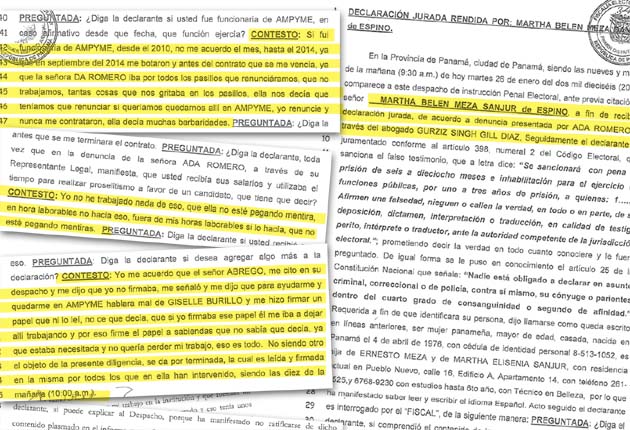 "Yo me acuerdo de que el señor Ábrego me citó en su despacho y me dijo que para ayudarme y quedarme en Ampyme, hablara mal de Giselle Burillo, y me hizo firmar un papel que ni lo leí, no sé qué decía; que si yo firmaba ese papel, él me iba a dejar allí trabajando, y por eso firmé el papel, a sabiendas de que no sabía qué decía, ya que estaba necesitada y no quería perder mi trabajo", dijo Mesa.
