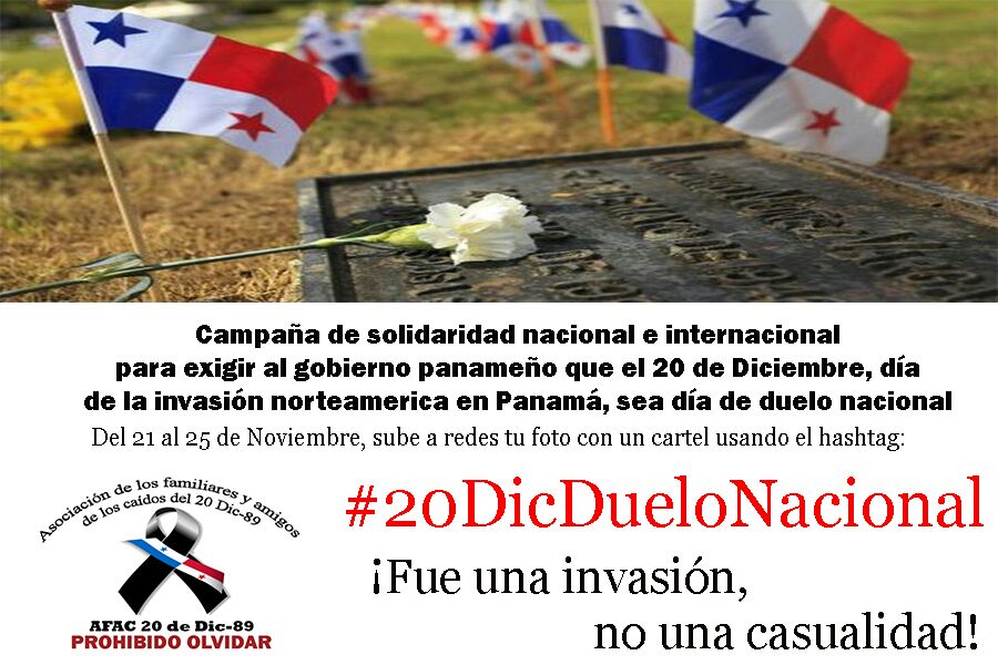 La Asociación de Familiares y Amigos de los Caídos del 20 de diciembre de 1989 (AFAC), exigen al gobierno que el 20 de diciembre sea Día de Duelo Nacional. Con la etiqueta #20DicDueloNacional realizan una campaña de solidaridad mediante redes sociales. Este pedido se da 27 años después que las tropas del ejército de Estados Unidos atacaran el territorio panameño y se muestra bajo el lema: 'Fue una invasión, no una casualidad'. Cabe recordar que el pasado 20 de julio se instaló por Decreto Nacional N° 121, la Comisión 20 de Diciembre, con el objetivo de investigar los hechos del 19, 20 de diciembre de 1989 y fechas subsiguientes a la ocupación estadounidense, sin embargo hasta la fecha no se ha ofrecido más que un informe preliminar por parte de la comisión. En octubre del año pasado, se intentó debatir la iniciativa en la Asamblea Nacional, pero no se logró por falta de cuórum, según informó Elena Miró, miembro de AFAC, quien persigue este objetivo.