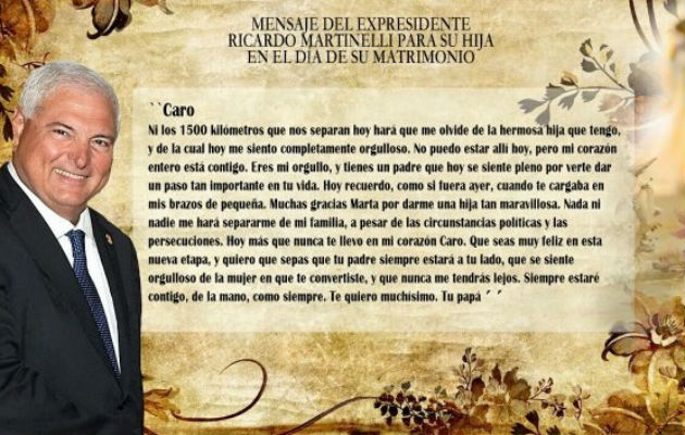 El expresidente, Ricardo Martinelli envió hoy un mensaje a su hija Carolina Martinelli Linares, en el día de la celebración de su boda, por lo civil. Martinelli además de lamentar no estar junto a su hija y familia, en esta fecha especial, dijo sentirse orgulloso de ella y le deseó que sea muy feliz. "Caro, ni los 1500 kilómetros que nos separan hoy hará que me olvide de la hermosa hija que tengo, y de la cual hoy me siento completamente orgulloso. No puedo estar allí hoy, pero mi corazón entero está contigo. Eres mi orgullo, y tienes un padre que hoy se siente pleno por verte dar un paso tan importante en tu vida. Hoy recuerdo, como si fuera ayer, cuando te cargaba en mis brazos de pequeña. Muchas gracias Marta por darme una hija tan maravillosa. Nada ni nadie me hará separarme de mi familia, a pesar de las circunstancias políticas y las persecuciones. Hoy más que nunca te llevo en mi corazón Caro. Que seas muy feliz en esta nueva etapa, y quiero que sepas que tu padre siempre estará a tu lado, que se siente orgulloso de la mujer en que te convertiste, y que nunca me tendrás lejos. Siempre estaré contigo, de la mano, como siempre. Te quiero muchísimo. Tu papá." señaló. Carolina contrae hoy matrimonio con Michel Garuz Salaverry