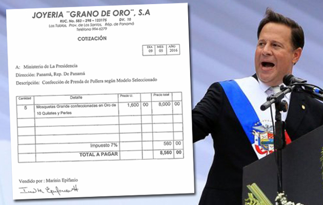 El gobierno del presidente Juan Carlos Varela, justificó la compra de cinco prendas de oro de diez kilates, que serían regaladas en los viajes oficiales de la pareja presidencial. A través de la cuenta de Twitter del Palacio de Las Garzas, el gobierno indicó que se trata de una compra amparada por la norma. "Estas compras son realizadas con apego a la ley y se obsequian con orgullo como muestra de nuestro folclor", se lee en el tuit. El lunes, este portal web, publicó una nota en la que se dio a conocer que el Ministerio de la Presidencia, compró cinco mosquetas de oro de diez kilates, con perlas incluidas, a una joyería del pueblo de Las Tablas. El documento oficial, señalaba que las joyas serían usadas como "obsequios protocolares en el extranjero, en misiones oficiales que realice la pareja presidencial, en nombre de la República de Panamá". Agrega la nota, y a manera de justificación, que con "el envío de estos obsequios, Panamá proyecta fortalecer las relaciones diplomáticas con los demás países".