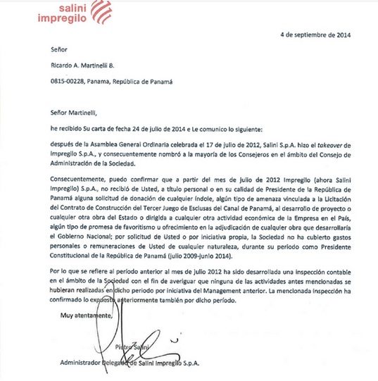 La nota detalla que no se recibió de Martinelli, a titulo personal o en calidad de presidente de la República, solicitud alguna de donación o amenaza vinculada a la licitación de la construcción del tercer juego de exclusas del Canal de Panamá.