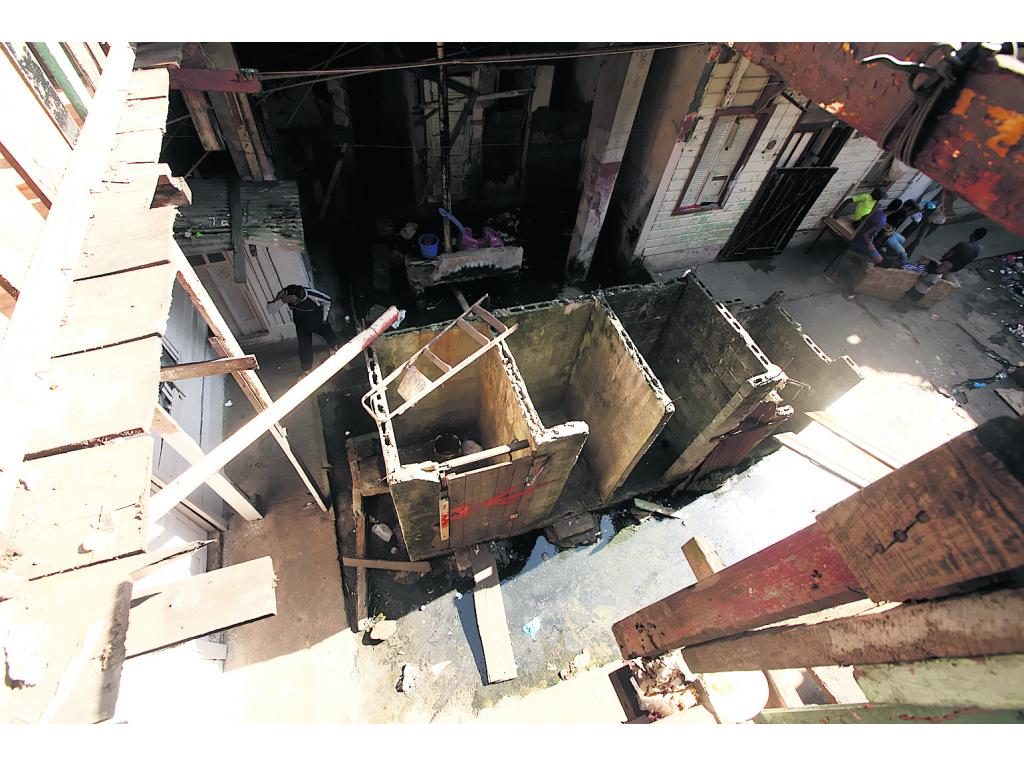 Las necesidades se hacen en un baño común en medio de un lúgubre solar, sin puertas, sin drenaje, sin inodoros. Las personas que viven en el primer piso suben a sus piezas por escaleras que a veces les faltan dos a tres escalones, y al pasar sobre ellas se estremecen.