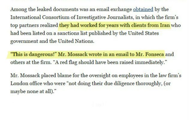El New York Times publicó un cruce de correos entre Jürgen Mossack y Ramón Fonseca Mora, que evidencia que los socios de la firma Mossack Fonseca sabían que hacían negocios “durante años” con “clientes peligrosos” de Irán, incluidos en una lista de empresarios con dineros mal habidos y con nexos con el terrorismo.
