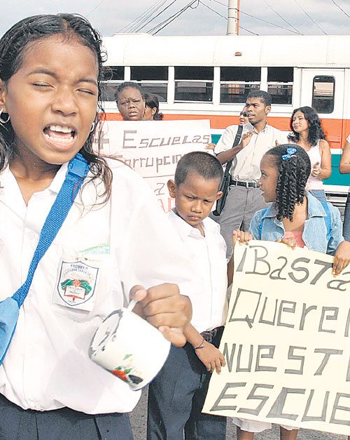 Estudiantes, docentes y padres de familia de la escuela Ciudad Santa Fe de Pacora, apoyados por transportistas del lugar, cerraron la Panamericana porque no quieren seguir dando clases en salones hechos con tablas. Foto: Hermes González / EPASA
