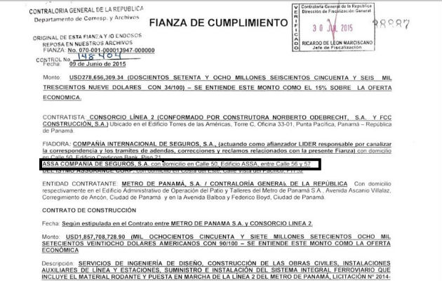 La fianza de cumplimiento de ASSA pactada por Odebrecht es de $103.1 millones.