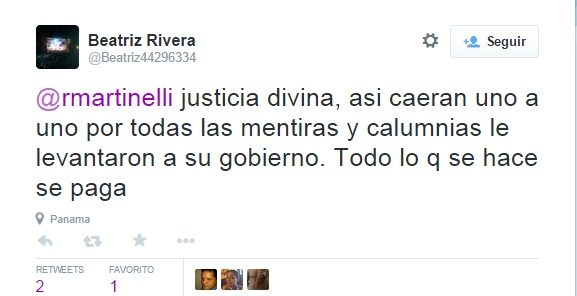 Beatriz Rivera dijo"justicia divina, así caerán uno a uno por todas las mentiras y calumnias le levantaron a su gobierno. Todo lo que se hace se paga". Por su parte Nineyka Sánchez señaló "ya apenas toco poder se olvido de su lucha por el Tabasará supuestamente bandera de sus protestas".