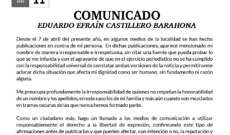 "Desde el 7 de abril del presente año, en algunos medios de la localidad se han hecho publicaciones en contra de mi persona. En dichas publicaciones, aparece mencionado mi nombre de manera irresponsable e irrespetuosa, sin citar una fuente que pueda probar lo que se me infunda y con el agravante de que en el ejercicio periodístico no se ha cumplido con la responsabilidad universal de constatar ambas versiones de la noticia y permitírseme aclarar dicha situación que afecta mi dignidad como ser humano, sin fundamento ni razón alguna", enfatizó el letrado, hermano de Marcos Castillero, presidente de la Asamblea Nacional.'