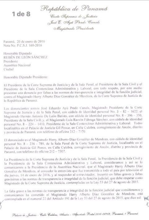 El magistrado presidente de la Corte Suprema de Justicia y de la Sala Penal José Ayú Prado; el presidente de la Sal Civil Hernán De León y presidente de la Sala de lo Contencioso, Administrativo y Laboral Luis Ramón Fábrega presentaron una denuncia contra su colega Harry Alberto Díaz González de Mendoza por faltas a la norma de la transparencia e integridad de la función judicial.