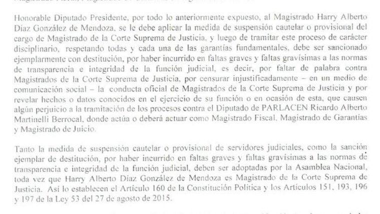 Los tres magistrados señalan en la denuncia que Díaz al conceder una entrevista por televisión el día jueves 14 de enero de 2016, y al responder al entrevistador incurrió en faltas graves y faltas gravísimas a las normas de transparencia e integridad de la función judicial, que debe respetar Magistrado de la Corte contempladas en la Ley 53 del 27 de agosto de 2015.