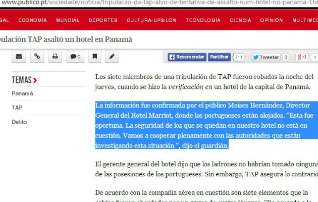 Por su parte, la página publico.pt, manifestó que "la información fue confirmada por Moises Hernández, director general del Hotel Marriot, donde los portugueses estaban alojados. Esta fue oportuna. La seguridad de los que se quedan en nuestro hotel no está en cuestión. Vamos a cooperar plenamente con las autoridades que están investigando esta situación ".