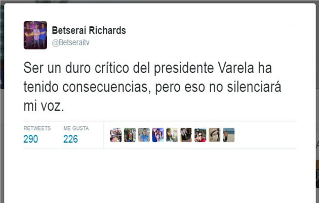 TVN Media aclaró que la salida del periodista Betserai Richards se debió al cierre del programa Al Decubierto y no por ser un crítico de la gestión del presidente Varela. En nota enviada a Panamá América, y como reacción a una publicación de este medio bajo el título "Atentado contra libertad de expresión por despido de Betserai Richards”, TVN pidió rectificación, alegando que “su salida de TVN Media fue en buenos términos”. “La salida del periodista Richards se debió al cierre del programa Al Decubierto y no por lo que ustedes indican”, indicó TVN. La información publicada surge por un comentario que colgó Betserai en su cuenta de Twitter, donde escribió: “Ser un duro crítico del presidente Varela ha tenido consecuencias, pero eso no silenciará mi voz”. No obstante, según la directora de Comunicaciones Corporativa de TVN, al contactar a Betserai, el periodista le habría explicado que el tuit “se debió a comentarios emitidos en otro medio donde ejerce y no había dado ninguna declaración vinculando a esta empresa”. El periodista de MEDCOM Álvaro Alvarado también reaccionó a este tema, mostrando su solidaridad con Betserai Richards, “A mí me han hecho de todo desde el gobierno para sacarme de circulación. No soportan críticas”, escribió.
