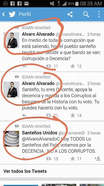 El expresidente Ricardo Martinelli denunció la creación de cuentas falsas desde donde se escriben ataques ofensivos, que se le atribuyen a su persona. "Favor dejen la campaña sucia", escribió el mandatario en su cuenta de tuiter. Además, Martinelli anunció que mañana presentarán una denuncia por el uso de la cuenta oficial del IDAAN para cuestiones políticas. La cuenta del IDAAN retuitió varios mensajes relacionados con la elección de hoy en el circuito 7-1. La entidad explicó que investiga un hackeo a su cuenta de Twitter luego de que desde esta cuenta personas ajenas a la institución retwittearan mensajes políticos. En tanto que, la Secretaria de Comunicación del Estado dijo que realizará las averiguaciones pertinentes en cuentas de twitter institucionales.