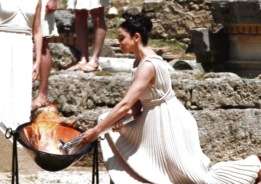 ¿Y cómo lo hacen? Actrices que representan sacerdotisas de Hestia colocan una antorcha en la concavidad de un espejo parabólico que concentra los rayos del Sol que, como en la antigüedad, enciende la llama que marcará el inicio de una realización más de los Juegos Olímpicos.