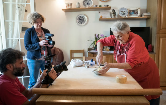 Vicky Bennison, creadora de Pasta Grannies, graba clase sobre pasta en la cocina de Rosa Turri en Faenza, Italia. Foto/ Francesco Lastrucci.
