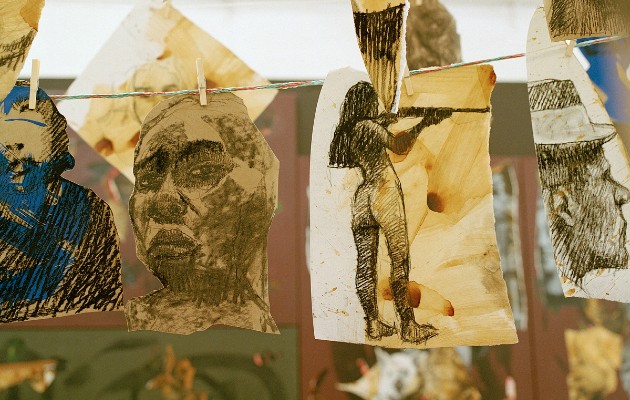 Ronald Muchatuta representó a su natal Zimbabue, a través de paneles pintados y dibujos colgados en tendederos, en referencia a líderes y eventos políticos.