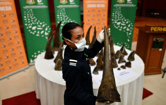 Élites en China y Vietnam regalan cuernos de rinoceronte. Cuernos decomisados en Kuala Lumpur el año pasado. Foto/ Manan Vatsyayana/Agence France-Presse — Getty Images.
