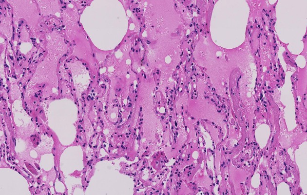 Alveolos pulmonares, llenos de líquido rosa y espeso. Foto / Shu-Yuan Xiao.