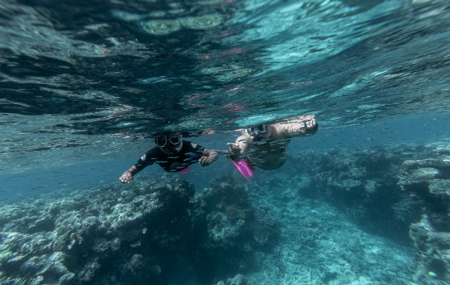 Murrumu de Walubara haciendo snórquel con su hijo en la Gran Barrera de Coral, que, dice, es territorio indígena. Foto/ Brook Mitchell para The New York Times.