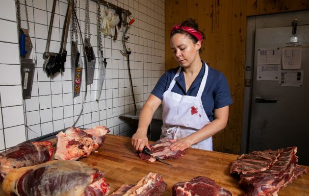 Janice Schindler, de 28 años, se convirtió en carnicera tras llevar un estilo de vida libre de animales en la prepa. Foto: Benjamin Norman para The New York Times.