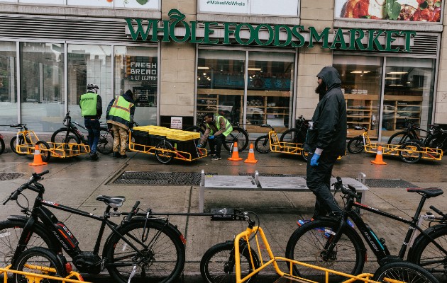 Con la pandemia suben entregas a domicilio. Organizando pedidos en una tienda de abarrotes en Manhattan. Foto / Bryan Banducci para The New York Times.